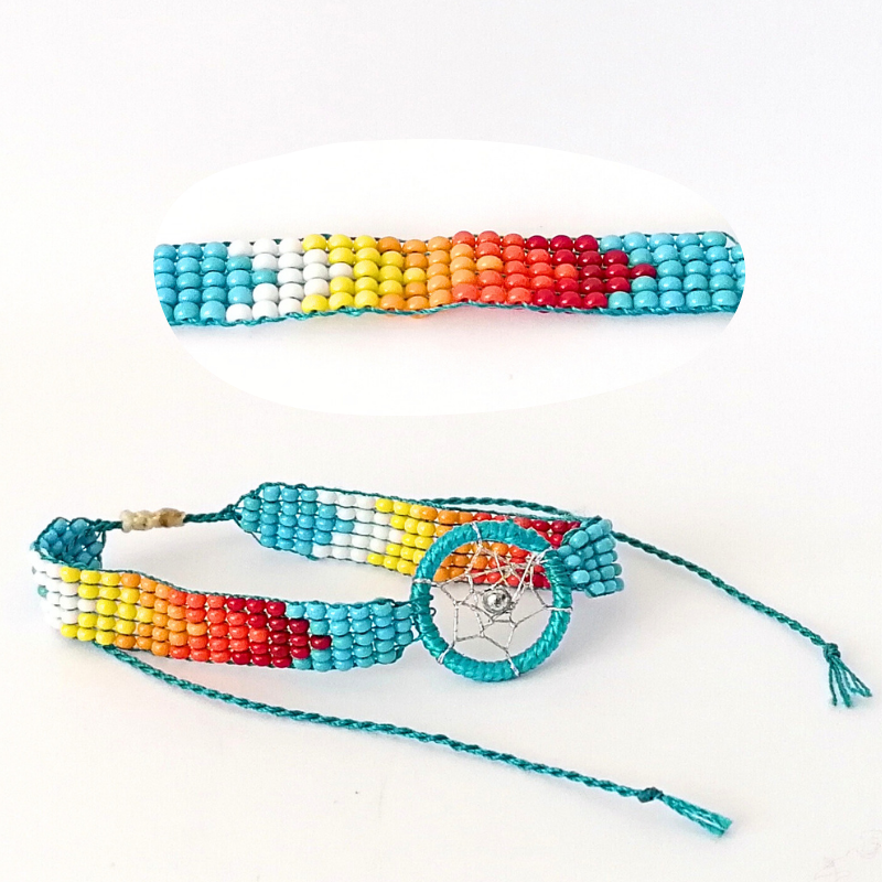 Poartă o poveste la încheietura mâinii. Această brățară cu dream catcher este rezultatul muncii migăloase și al sufletului pus în fiecare nod de către creatorii săi din Otavalo, un sat montan din Ecuador cunoscut pentru moștenirea sa culturală și abilitățile în arta decorativă cu mărgele.