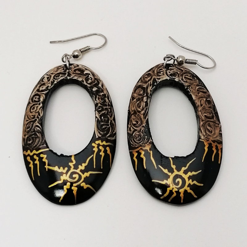 Lemn ușor și tratat, de obicei cu margini rotunjite pentru confort, pictură realizată manual, utilizând culori rezistente la uzură și luciu protector. Acești cercei din lemn natural impresionează prin simplitatea și eleganța lor rustică. Fiecare pereche este realizată manual, din lemn de înaltă calitate, oferind un aspect unic și autentic.