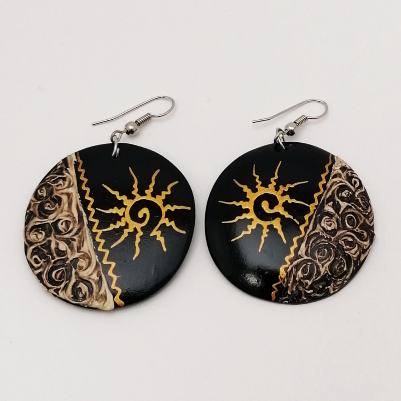 Cercei din lemn pictat cu soare si mare lemn ușor și tratat, de obicei cu margini rotunjite pentru confort, pictură realizată manual, utilizând culori rezistente la uzură și luciu protector. Acești cercei din lemn natural impresionează prin simplitatea și eleganța lor rustică. Fiecare pereche este realizată manual, din lemn de înaltă calitate, oferind un aspect unic și autentic.