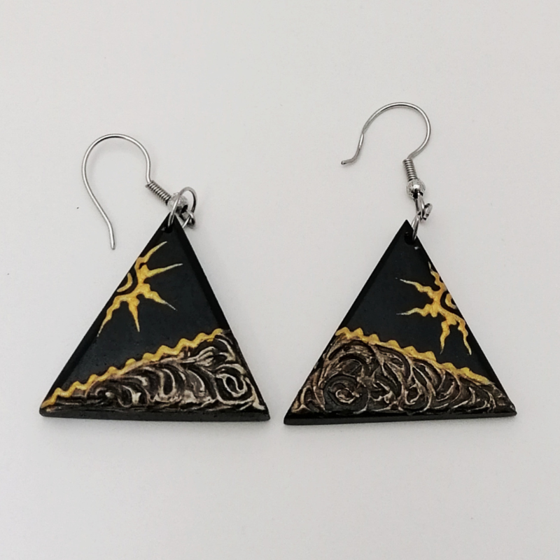 Acești cercei triangulari din lemn pictați manual aduc la viață imaginea unui peisaj de vară cu soarele strălucitor și valurile mării. Designul vibrant, plin de culoare, face ca acești cercei să fie accesoriul perfect pentru zilele însorite sau vacanțele la mare. Fiecare pereche este realizată cu multă atenție la detalii, oferind un look original și jucăuș. Datorită formei lor unice și a combinației de culori, cerceii adaugă un aer proaspăt și energic oricărei ținute. Acest accesoriu inspirat de natură va aduce un strop de vară în garderoba ta!