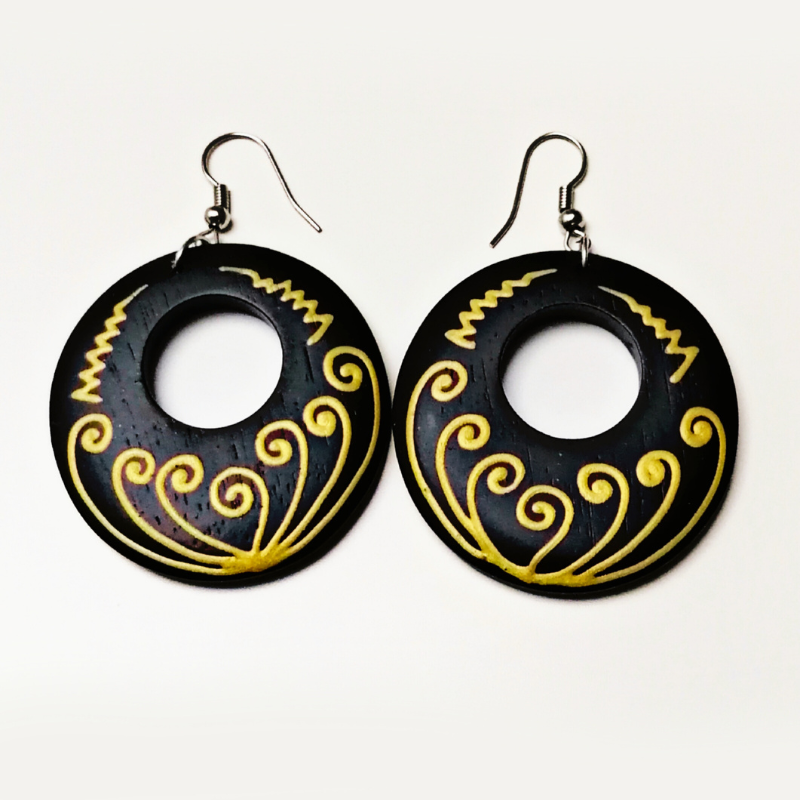 Lemn ușor și tratat, de obicei cu margini rotunjite pentru confort, pictură realizată manual, utilizând culori rezistente la uzură și luciu protector. Acești cercei din lemn natural impresionează prin simplitatea și eleganța lor rustică. Fiecare pereche este realizată manual, din lemn de înaltă calitate, oferind un aspect unic și autentic. Designul tribal adaugă un aer modern