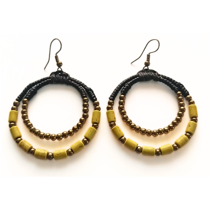 Structura din alamă asigură durabilitate și un aspect autentic, iar ața cerată completează designul printr-un finisaj plăcut și bine lucrat. Mărgelele din plastic adaugă un plus decorativ și evidențiază stilul handmade al produsului. Fiecare pereche este realizată în Indonezia, într-un stil artizanal inspirat din tehnicile tradiționale locale.