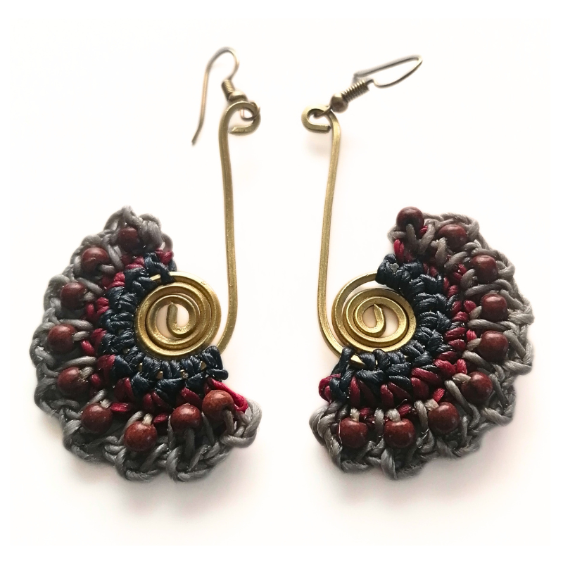 Cercei handmade spirală din alamă, ață cerată și mărgele din plastic, fabricați în Indonezia. Accesoriu elegant și original.