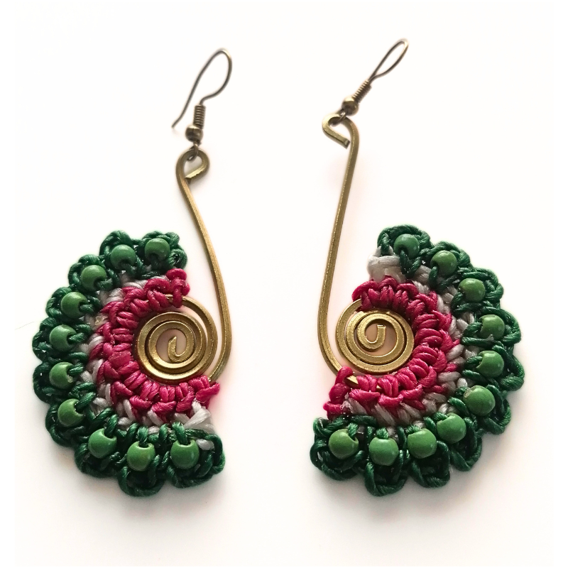 Cercei handmade spirală din alamă, ață cerată și mărgele din plastic, fabricați în Indonezia. Accesoriu elegant și original.