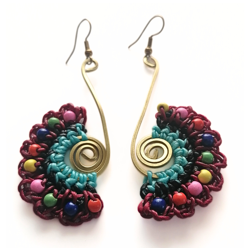 Cercei spirală din alamă cu ață cerată și mărgele din plastic.
