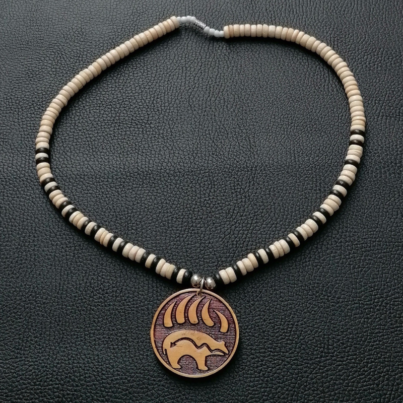 În centrul colierului se află un pandantiv decorativ, cu modele tribale simbolice, asociate cu norocul și protecția spirituală. Designul neutru și natural permite purtarea acestuia atât de femei, cât și de bărbați, fiind ușor de integrat în orice ținută casual sau cu accente etnice.