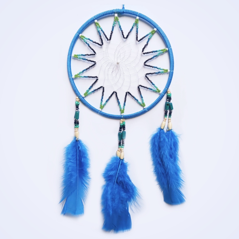 Fiecare detaliu contează – pene moi de culoare albastru , mărgele tradiționale și o rețea centrală inspirată de cultura nativă, toate lucrate cu grijă pentru a crea o piesă unică.